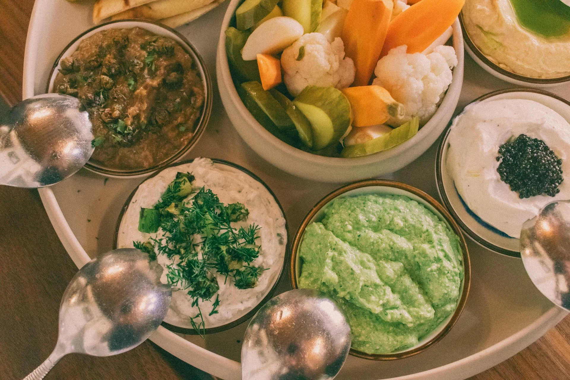 A tray of various Greek dips and vegetables, including hummus topped with caviar, green guacamole, a creamy white dip garnished with herbs, a salad of chopped vegetables, and another dish with cooked eggplant, all with small serving spoons.